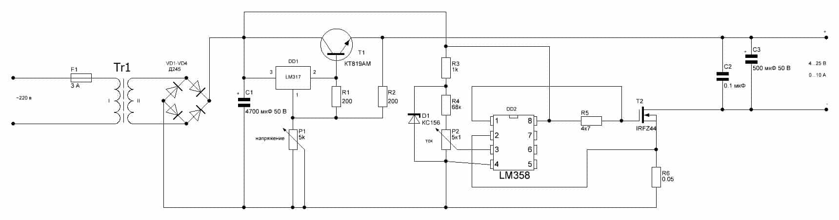 Сетевое напряжение понижается до 25 В силовым трансформатором Тr1, выпрямляется диодным мостом VD1-VD4, сглаживается конденсатором С1 и поступает на регулируемый стабилизатор, собранный на микросхеме DD1 и транзисторе Т1. Регулировка производится переменным резистором P1.